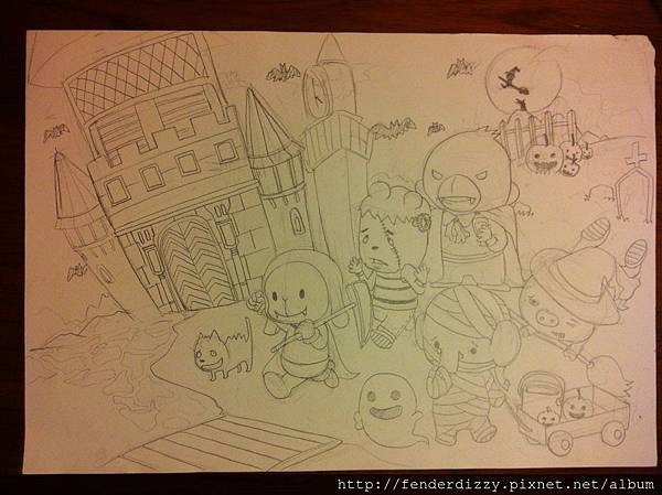 這次草圖就是先畫樂樂果興高采列的結伴去勒索糖果!